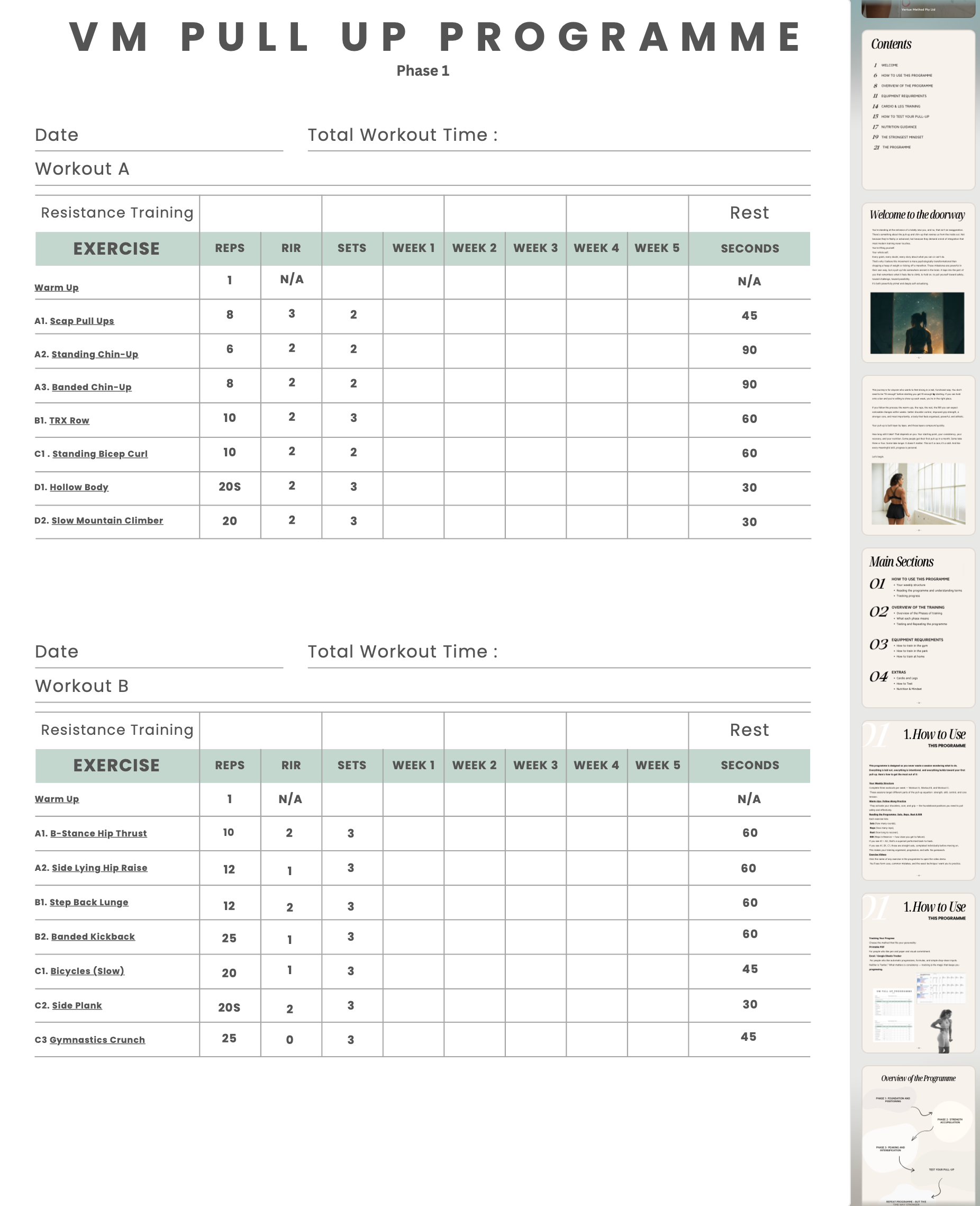 Build the strength, skill, and confidence required for your first pull-up (or your first clean one). This programme develops the real engines of the movement — lats, core, grip, and scapular control — while training your nervous system to move with precision, power, and ease.